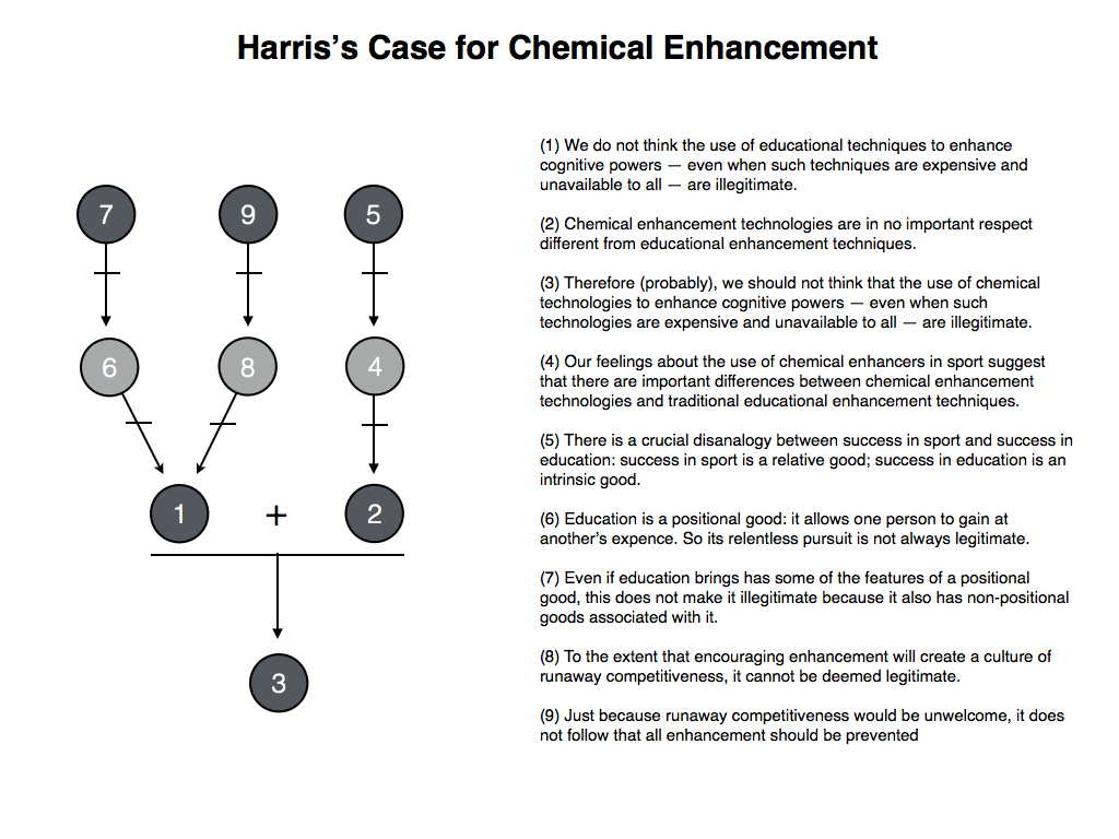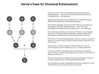 Harris’s preferred idiom is that of the rhetorical question; my preferred idiom is that of the formal argument. So I’d like to take Harris’s questions, combine them with his original thought experiment, and craft the following analogical argument in favour of chemical enhancement.