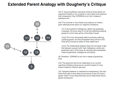 Dougherty identifies two serious flaws in this argument. The first is in the formulation of premise (12). Wykstra deliberately relativises his argument to what we know about our cognitive limitations. This, in many ways, is what allows him to reach the conclusion that he does. But the whole point of the Rowe/Russell critique was that, given theism, we wouldn’t expect to have such cognitive limitations in the first place. If God really cared about us, like a loving parent cares about their child, he wouldn’t have given us those limitations. So to relativise the argument in this way is to miss the point of critique.