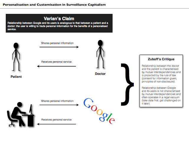 But Zuboff resists this analogy. She argues that something like the doctor-patient relationship is characterised by mutual interdependencies (i.e. the doctor relies on the patient for a living; the patient relies on the doctor to stay alive) and are protected and grounded in the rule of law. The disclosures made by are limited, and subject to an explicit consensual dialogue between the service user and service provider. The relationship between Google and its users is not like this. The attempts at consensual dialogue are minimal (and routinely ignored). It is not characterised by mutual interdependencies; it often operates in a legal vacuum (extract first, ask questions later); and there are no intrinsic limits to the extent of the information being collected. In fact, the explicit goal of companies like Google is to collect so much personal information that they know us better than we know ourselves.